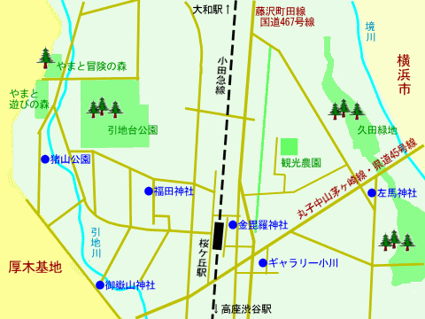 道順/小田急線・桜ヶ丘駅下車→西口から線路と直角方向に道なりに歩いて→富士見橋を経て坂を登りきった所の十字路を左折→引地川の「おんたけばし」を渡り公園に登ると御嶽山神社(約15分)