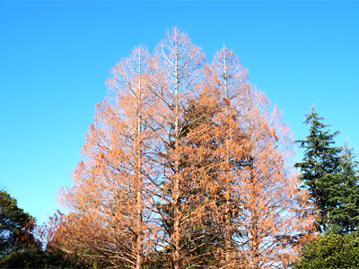 引地台公園児童広場のメタセコイア、紅葉の後でしたが青空に映えていました。児童広場には「マフラーや首ひものついた帽子をしたまま遊ぶのはあぶないよ」などルールをまもってみんなでなかよく遊ぼう!というカンバンが立っていました。(2026年1月6日撮影)