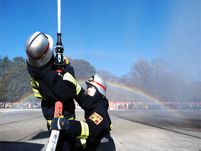 新年恒例の消防出初式、天候が心配されましたが晴天にめぐまれました。フィナーレを飾る一斉放水では、会場正面に虹がかかり、放水する必死な消防団員の姿が印象的でした。(2026年1月11日撮影)