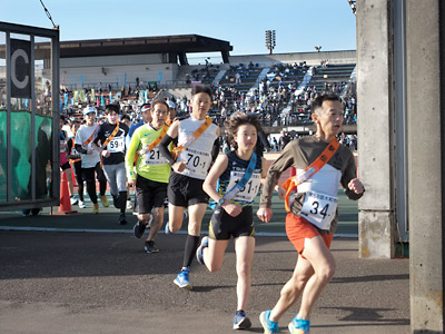 新年恒例の駅伝競走大会、天候に恵まれ選手たちが元気にスタートを切りました。写真はトラックをまわってコースに走り出す様子、今年も元気をもらいました。(2026年1月18日撮影)