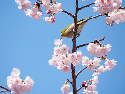暖かくなったり寒くなったりの今日この頃ですが、ふれあいの森のオオカンザクラはほぼ満開に。さっそくヒヨドリやメジロがやってきて花の蜜を吸っていました。(2026年3月5日撮影)