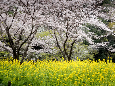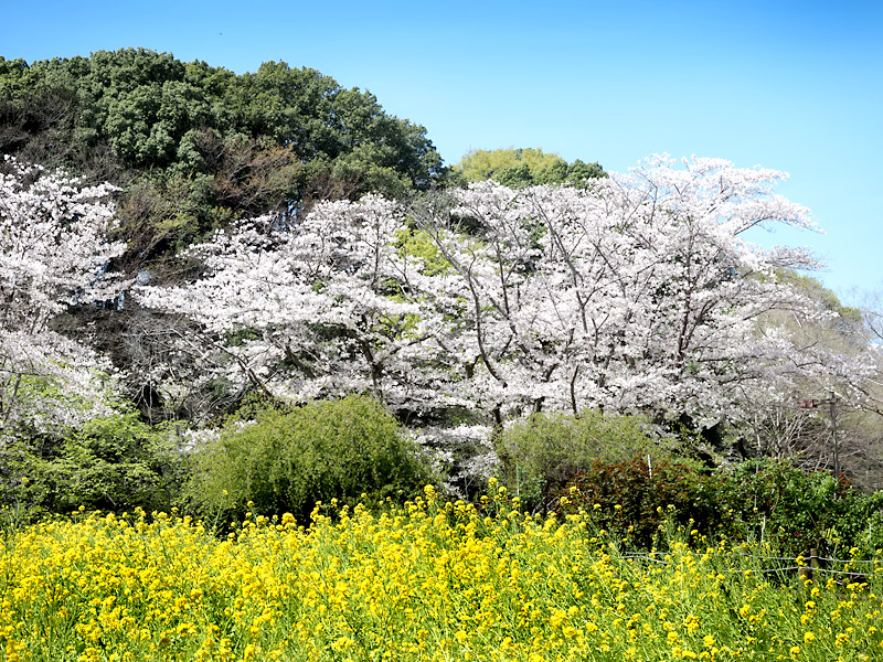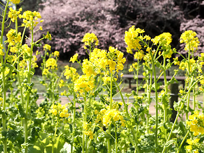ふれあいの森の花壇で菜の花が満開になっていました。例年ですとチューリップが植えられていて、さくらの花との共演が楽しめたのですが・・・。写真の奥のさくらは早咲きのオオカンザクラです。(2026年3月11日撮影)