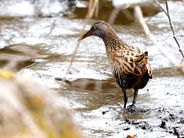 泉の森にクイナがやってきていました。冬になると北方から移動してくる漂鳥で、薮の中にいることが多く、ほとんど姿を見ることができませんが、水位が下がったしらかしの池で出会うことができました。(2026年3月17日撮影)